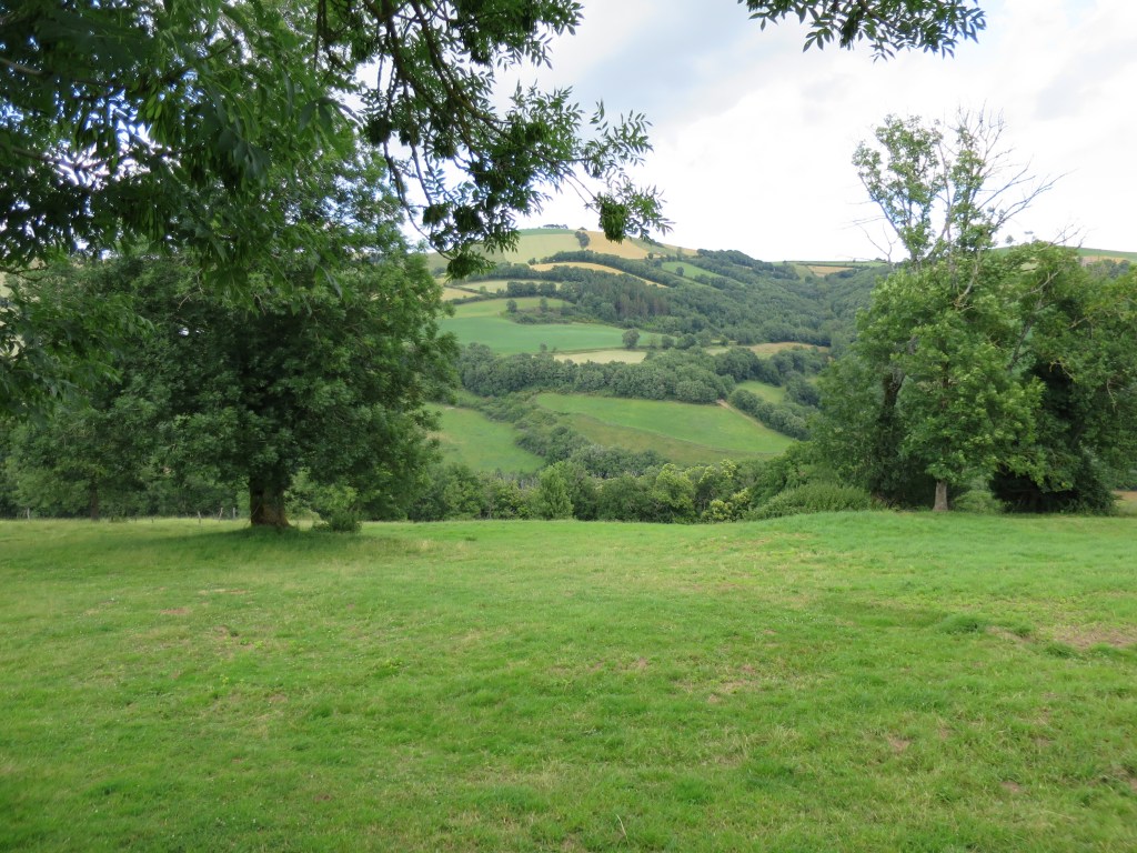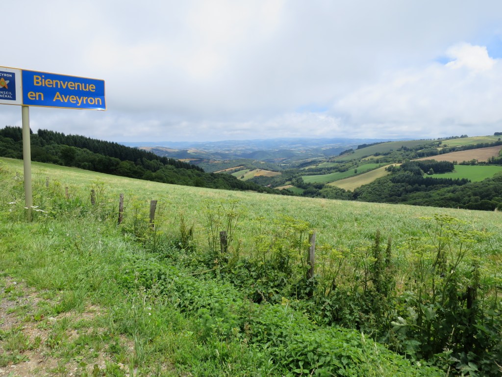 Wheat, barley, hay, pasture, vines, maize. A patchwork of small hedged fields. Areas of deciduous and coniferous woodland. A small-scale, various, undulating landscape. A raggedness, as if too much neatness would be irritating, with margins (here’s a wheat field stopping at a house lawn, with no fence between), an area not too much under pressure, where you can live and let live. And, as I approach the highest point, 750m, the cloud clears, and the sun comes out, illuminating the variegated fields and the dark green woods that to the left drop down into the Tarn valley, ahead rise to the Massif, revealing the sunlit blue distance. Struck, awed by its beauty, I have to stop. And look.