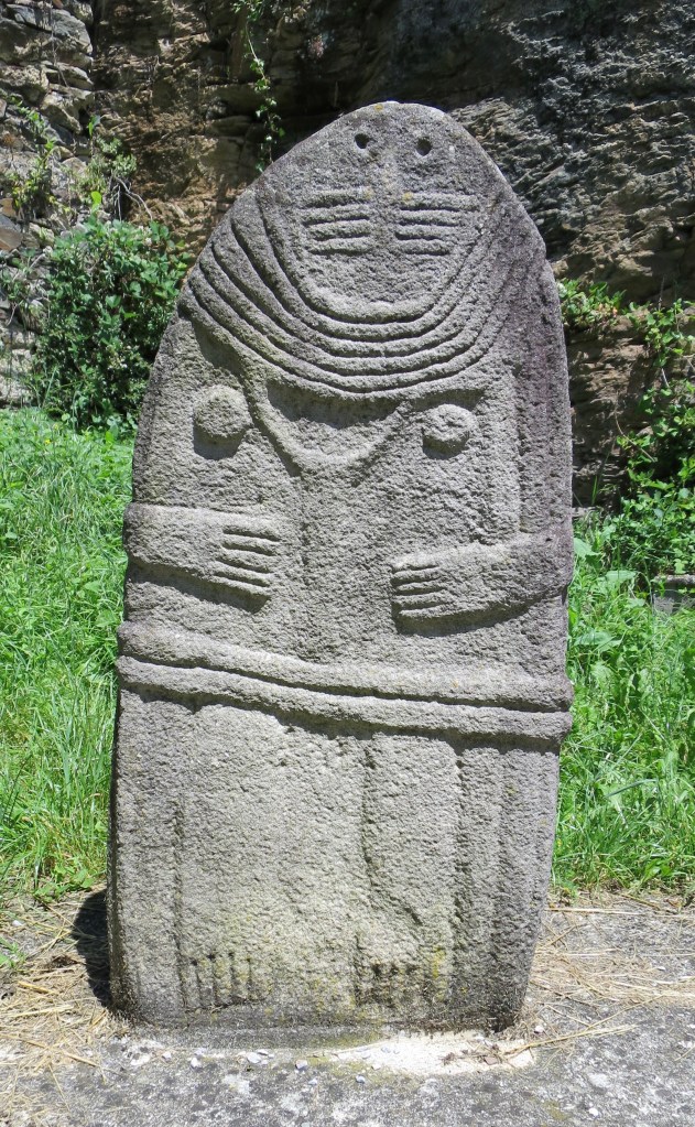 By the tributary stream, Le Merdanson, there is a copy of a small, carved stone menhir, set up where the original (now in the museum in Rodez) was found. Dated to 3500-2500 BC, it is a stylised female figure, remarked on for its ‘sculpture soignée’, carved with a complex iconography that would repay long study.