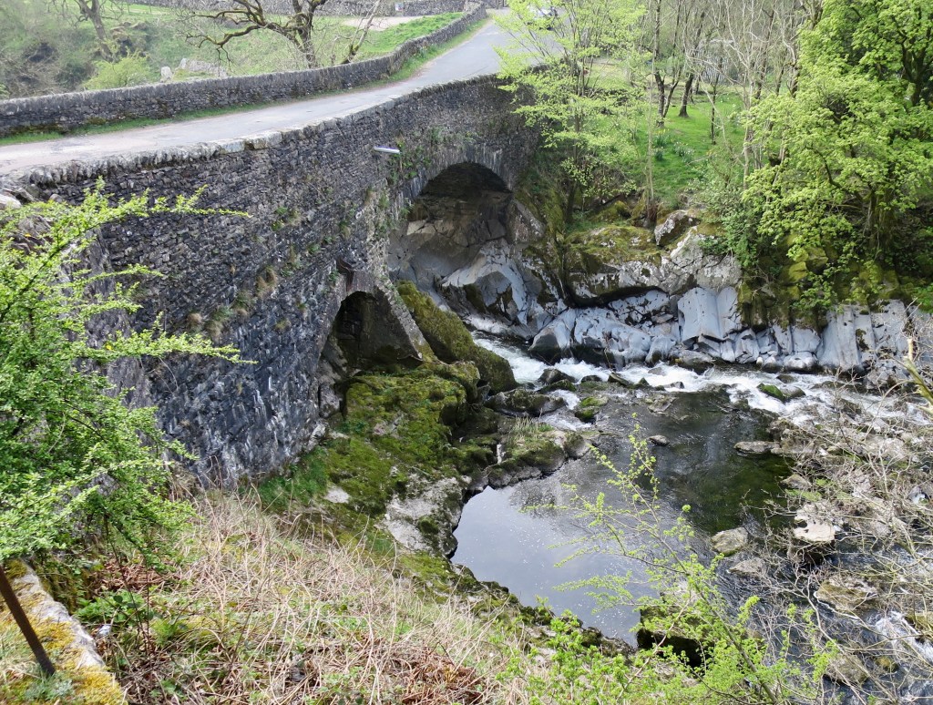 After wide open, bare grass Lunesdale, the Gorge is a narrow linear wood of variety and dappling shade, trees that grow on either side and over a river carved into rock, its nature ever changing. Here a deep pool, transparent as amber, with a shadowy trout deep down. Here it ripples, rattles, dazzles over and between white stones, creating miniature rapids – I imagine miniature people in miniature boats running them. Here a long stretch of dark water, with long jagged submerged rocks like prehistoric megacrocodiles. Terns, heron, a mewing buzzard, wagtails. A sudden spark of emerald/sapphire flashes bullet-like upstream. There are narrow stone bridges that cars creep across, wing mirrors pulled in. This one has two arches like stern eyebrows.