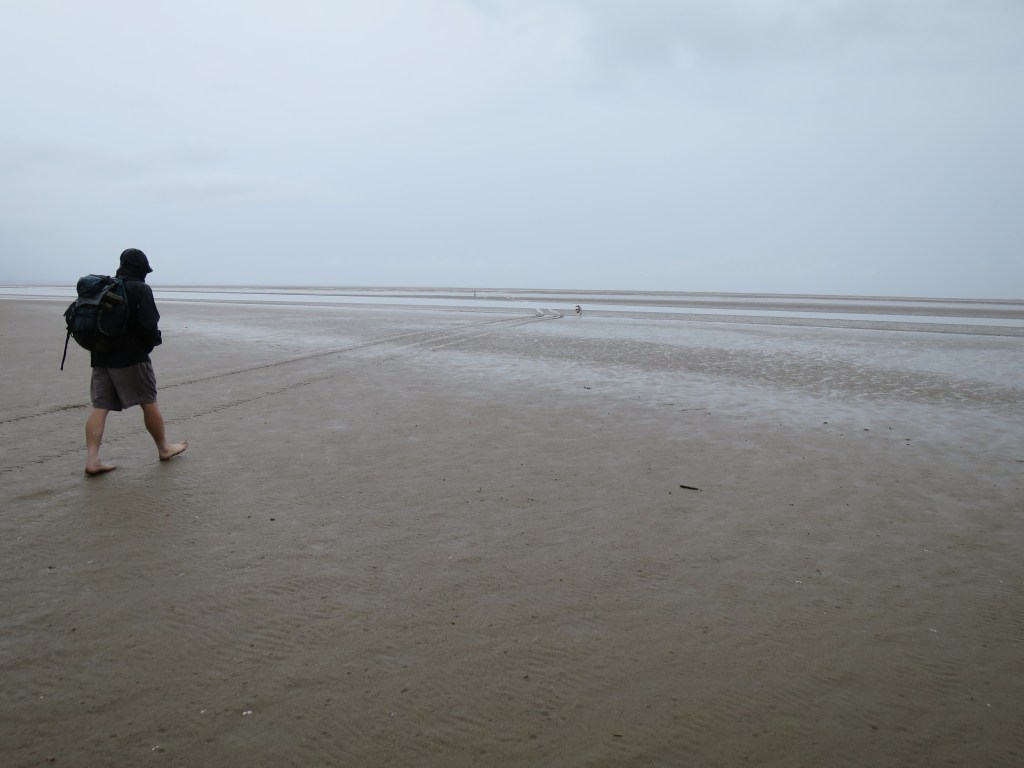 Then a long walk across featureless sand. Surprisingly large ups and downs, like solid, wet Saharan dunes; in the dips, the horizon disappears. How easy to go astray without landmarks: Arnside Knot, Heysham Power Station, the gap that is the Irish Sea, Barrow, Coniston Old Man, Grange-over-Sands promenade bleached and softened by the rain.
