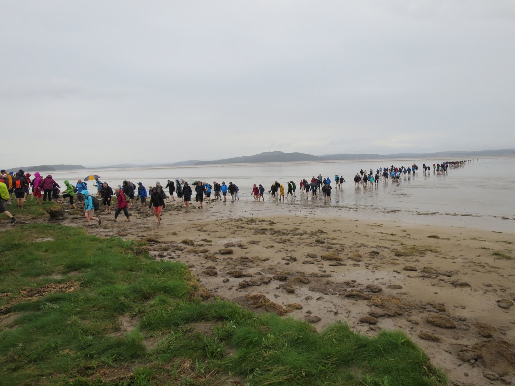 And then came the railway. And then a few recreational crossings. I crossed in the early 1950s, it must have been with William Burrow (“1950–1963. Died in office”.) A Sunday school outing? Not many in the party, anyway. Now there are 18 crossings a year. It used to be from Hest Bank, the crossing, but shifting channels have moved it to Arnside. And today I and the other 499 sponsored walkers are wearing “Friends of The Lake District” tee shirts as we head down the coast from Arnside. It begins to rain.