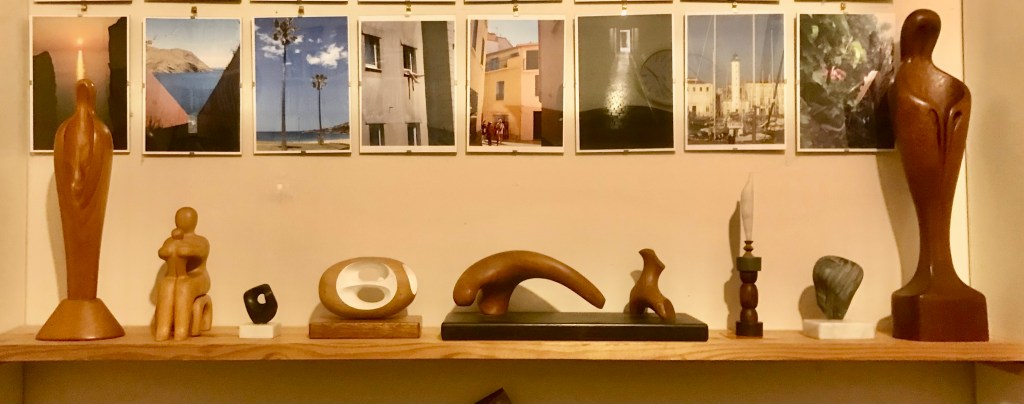 And set out my brother’s sculptures on a shelf, with my photographs behind.