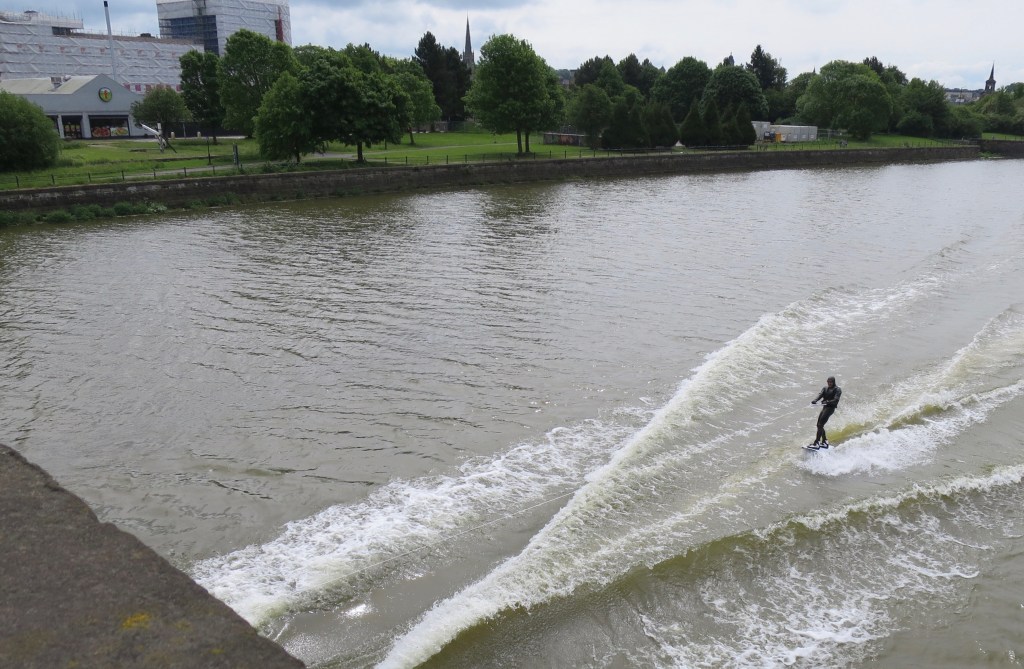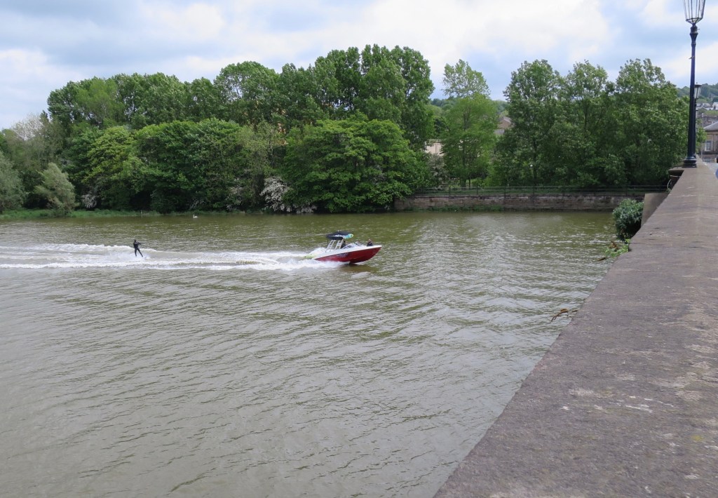 Bank holiday, high tide, crossing the bridge, coming closer is the whine and roar of a high-revving engine … and from around the bend under Greyhound Bridge bursts a speeding motor boat, followed by a figure on a single ski slaloming back and forth across the wake, whooping, under the bridge below me, and round the bend upstream.