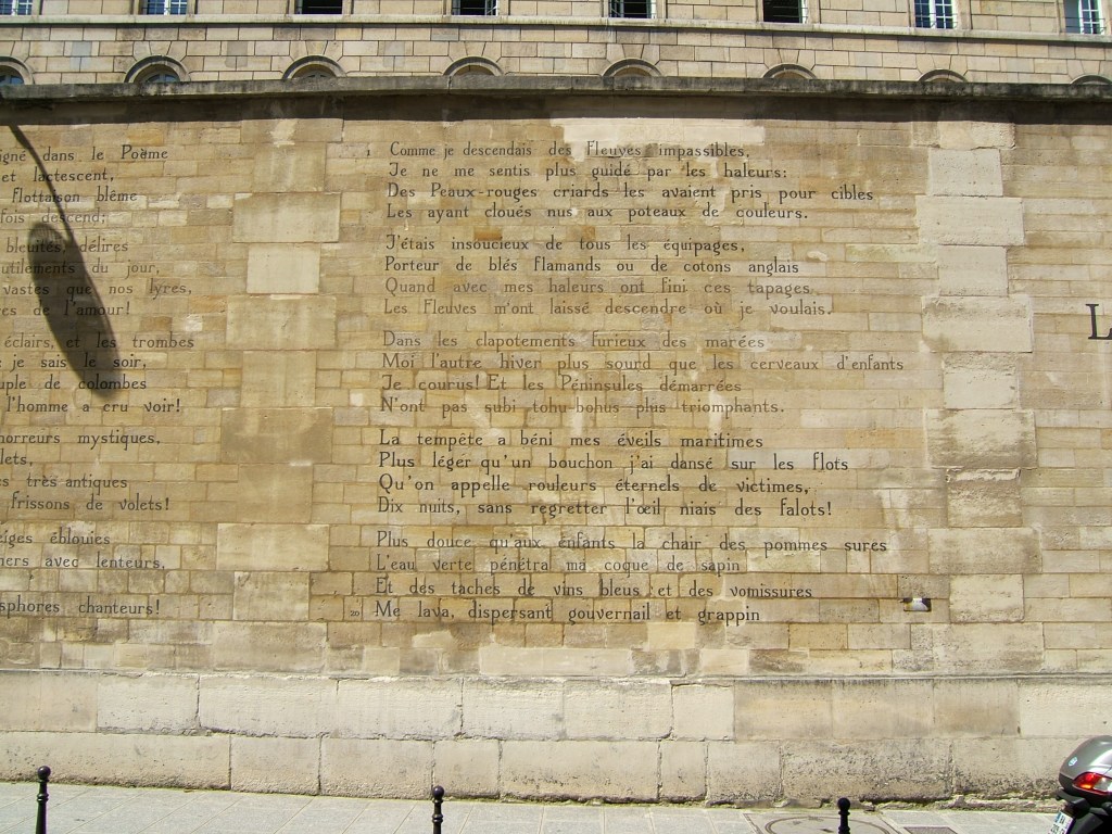Over the river, and on. North of the river, the streets zigzag across the Meridian. South, the Left Bank, they follow the line directly. Past the street of Christo’s first ‘intervention’ (he blocked it with barrels), and the site of Debord’s famous graffito (how they must wish they had not cleaned it off, preserved it under Perspex, a tourist site!), through the once-Bohemian Left Bank, now smart galleries rather than radical bookshops. Into St-Germain, past Café Flore and Deux Magots. The cobbles, used in 1968 to build barricades, beneath which is the dreamed-of beach, are now sealed under two inches of tarmac. Past the bar where the seventeen-year-old Rimbaud electrified literary Paris with his reading of Le Bateau ivre, and past the wall on which the text of the poem, vastly enlarged, has now mysteriously appeared, “Comme je descendais des Fleuves impassables, Je ne me sentis plus guidé par les haleurs …” no longer guided …