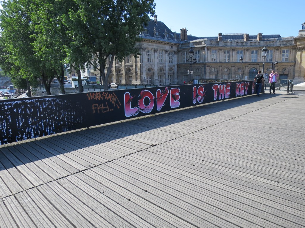I push my bike across the Pont des Arts. It is eerily empty. It is a pedestrian bridge, wooden-decked, and until recently had wire mesh at the sides, the river glittering through the mesh, the mesh heavy and shining with lovers’ locks. Now they’re gone, replaced by solid panels painted with a wire mesh pattern, and ‘love is the key!’ I have never understood the association of love and locks, but, with their spontaneous felt-tipped initials and hearts, their memories of moments, they humanised, democratised and brightened up the bridge. So, they’ve been removed, and the view of the softly moving water has been sealed off.