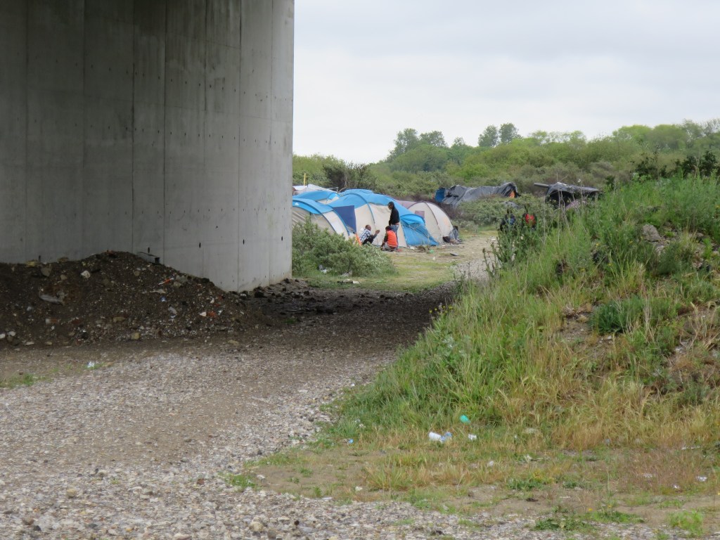 I follow yet another sign to Dunkirk, which takes me, along roads lined with parked lorries, miles of them, of every European state, yet again to a motorway. Under it, there is a squatter camp.