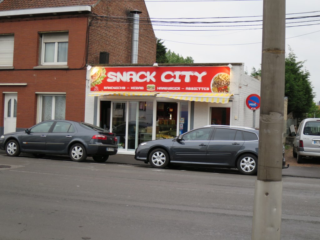 Time to eat. I had passed a street of shops, and return there, hoping for a small, family-run restaurant. But of course, as in England, such places are long gone, and only the immigrant entrepreneurs are open in a quiet suburb on Sunday evening. There are two Libanais takeaways. One is the hang-out of youths in vests with tattooed arms and flexing muscles. The other, ‘Snack City’, is busy, the place that feeds the community. An old white couple are eating in the dining section. A group of Africans enter and shake hands shyly all round. People of all ages wait to be served.