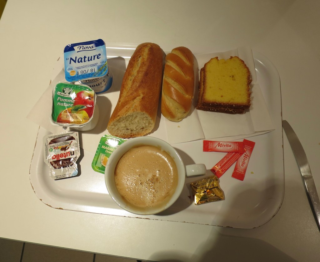 The radio is loud, the breakfasters’ voices are quiet. Conversations are whispered. Less from fear of being overheard than a reluctance to break into the silence. There is none of that French acknowledgement as someone enters, no ‘bon appétits’. Everyone is in their bubble, and the surrounding silence is what keeps the bubbles intact. There is no society, each is here not as a person but as a set of functions. Privacy, anonymity is all.