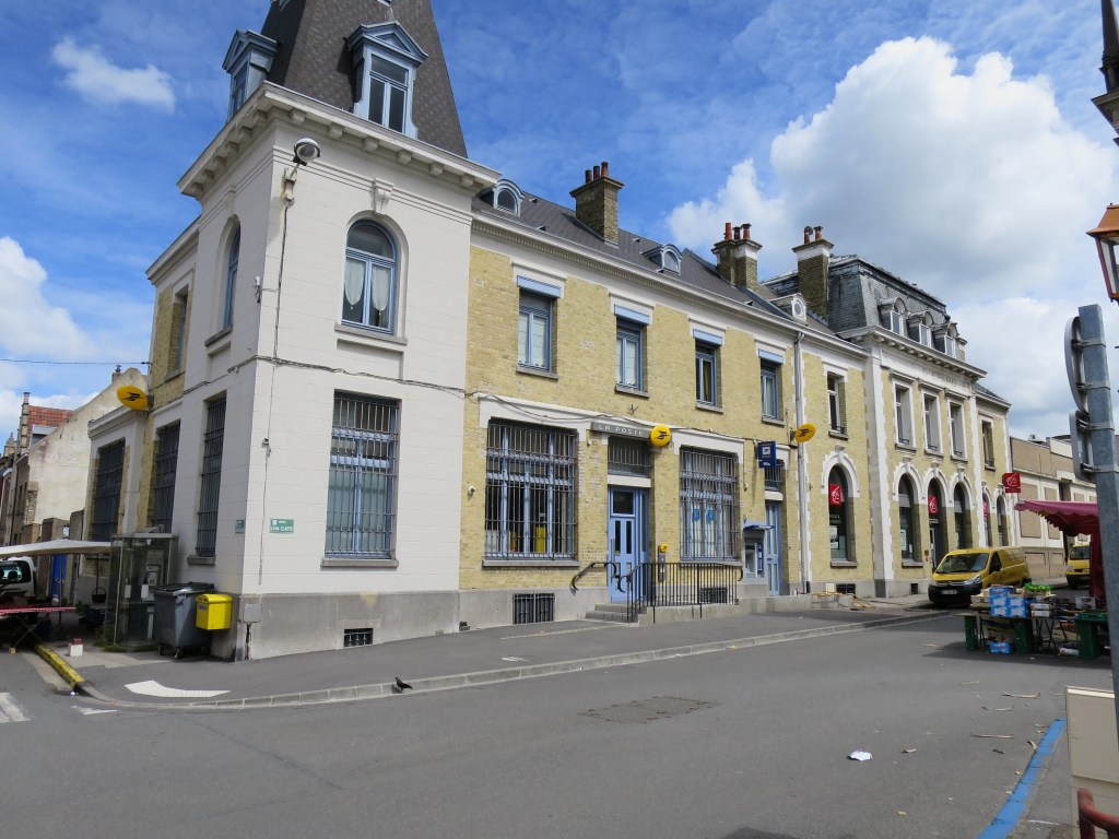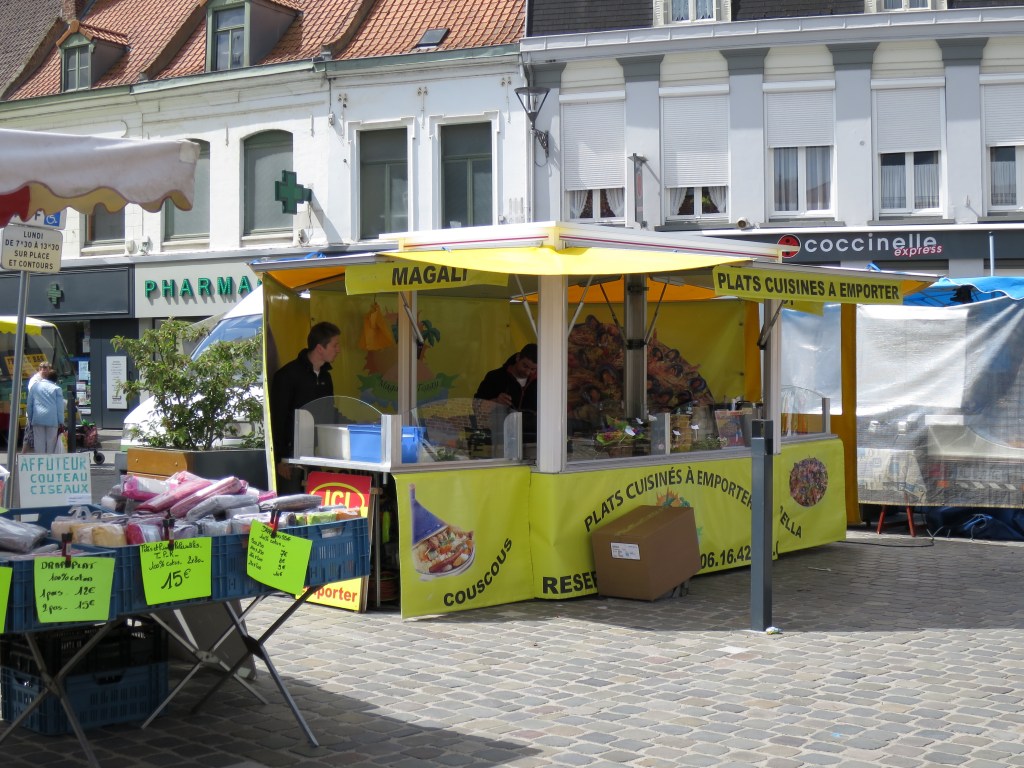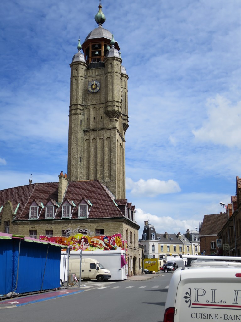 I cycle into the centre, into the square, and enter – a film set! It’s ‘Bienvenue Chez les Ch’tis‘! The sun is shining, the square is full of colourful stalls and entertainments, the carillon that Antoine played so deliriously rings out from the familiar tower. There, see, is the yellow lunch-wagon, where the friends ate, and over there the actual post office, and behind it the sorting office (for fifteen years I was a postman) … Are they filming Bienvenue 2?