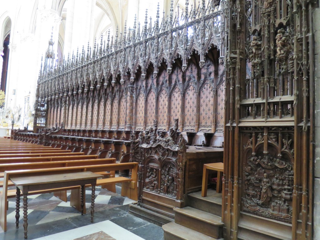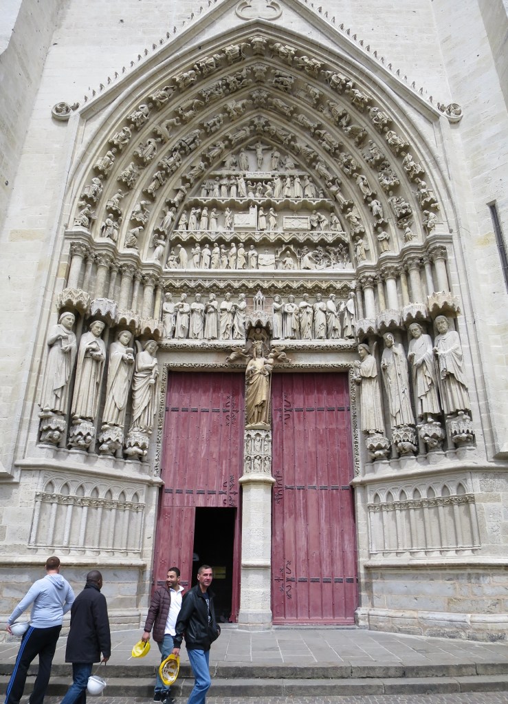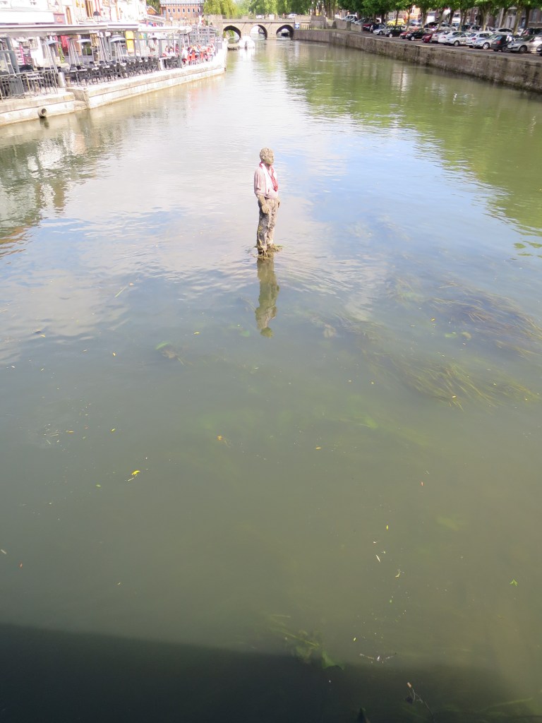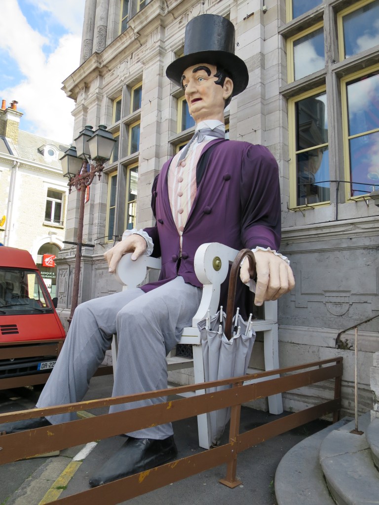 Outside the town hall sits one of the giants beloved of Flemish towns. This a splendid gent, a dozen feet tall, in stovepipe hat, with mauve jacket, cream trousers, an umbrella and the mildly-amused, stoical look of one who knows the world never really makes sense, but that’s life. They are still walked with pride through the streets in annual carnival. (The last of England’s perambulating giants, in Salisbury, ceased walking over a century ago.)