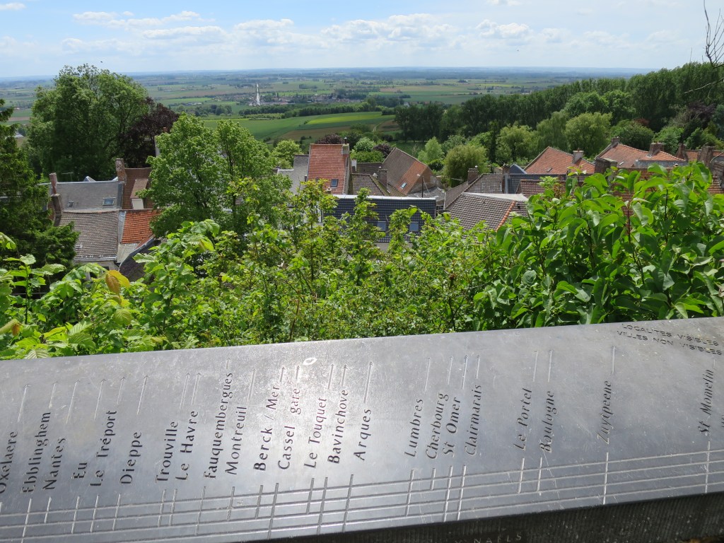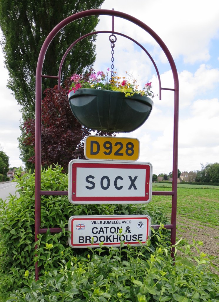 Cycling south-west, in sunshine, into the wind, across rich wide agricultural land reclaimed from the sea, towards a Meridian marker at Bollezeele, I pass through the village of Socx. It is twinned, a flower-garlanded sign announces, with two small villages three miles from my home town. When did that happen? After I left. But another unexpected echo.