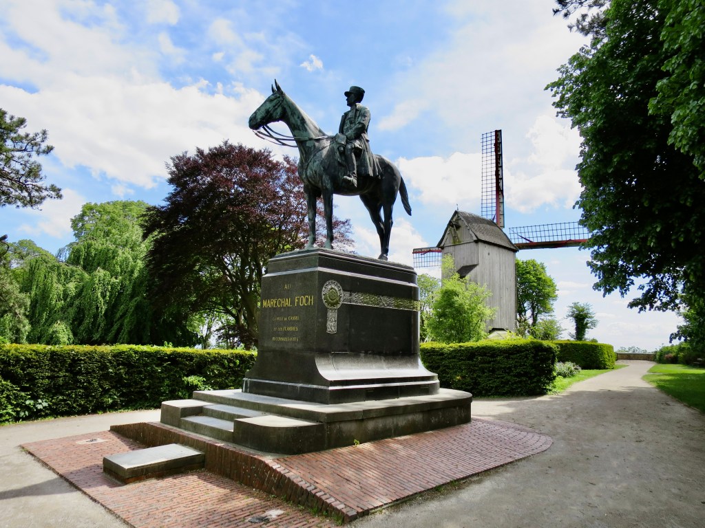 At the top is a wooden windmill, the last of twenty-nine that once ground noisily up here, and a statue of Marshal Foch, on horseback, facing east. Here he spent ‘some of the most distressing hours of my life’ staring out over the mechanised slaughter of the Western Front less than thirty kilometres away. The horse gives a clue to the reason for his hapless dismay.