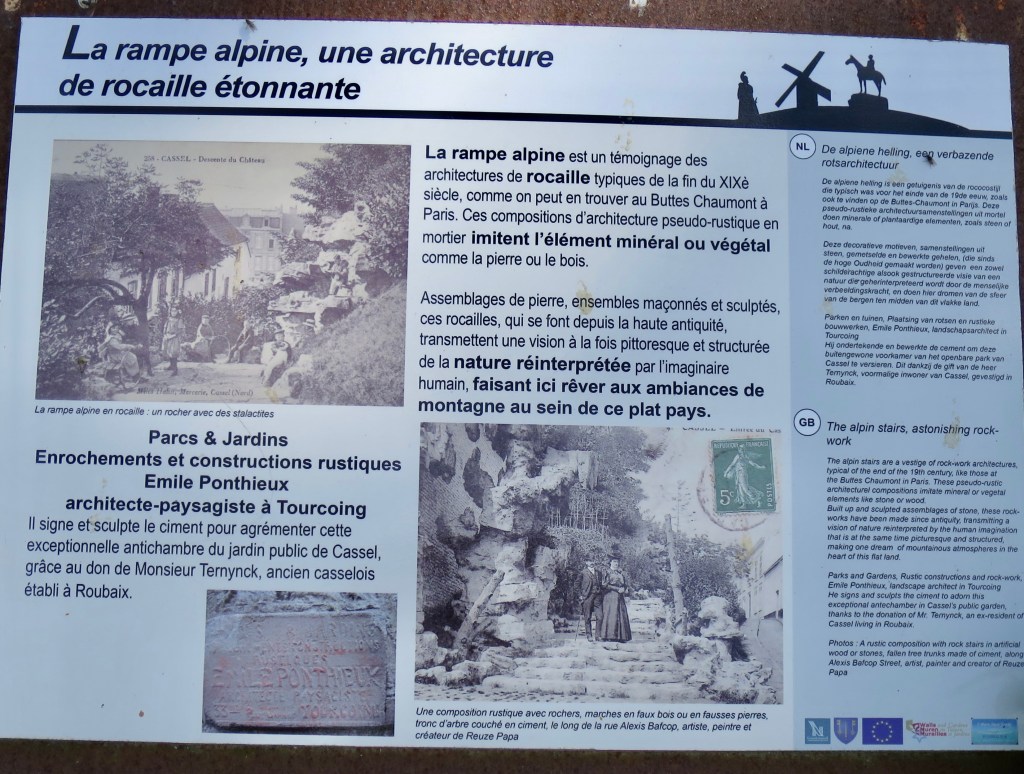 The descent into the village, on foot from this belvedere, is enchanting. It is one of those nineteenth-century curiosities, ‘pseudo-rustiques en mortier’,concrete shaped to imitate the wood of handrails and the rough stone slabs of steps, between artificial cliffs. So that instead of a simple set of even, granite steps, the way down is a romantic path through a rocky defile, between towering white cliffs, where plants nestle and cling, on ghostly white, uneven steps, with railings and seats of wood uncannily turned to white stone.