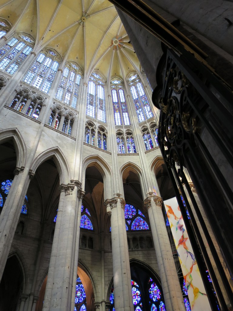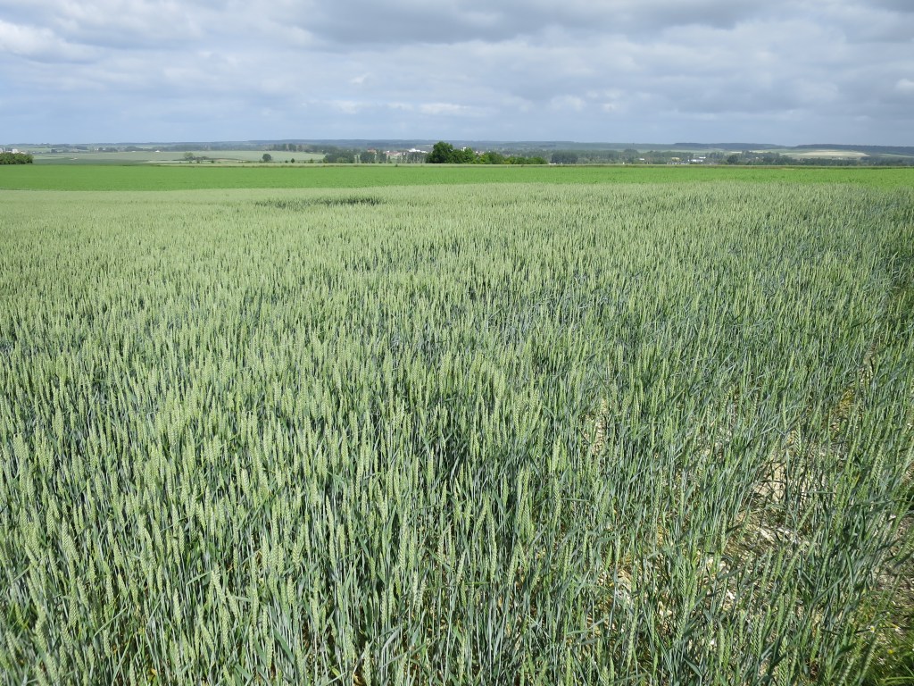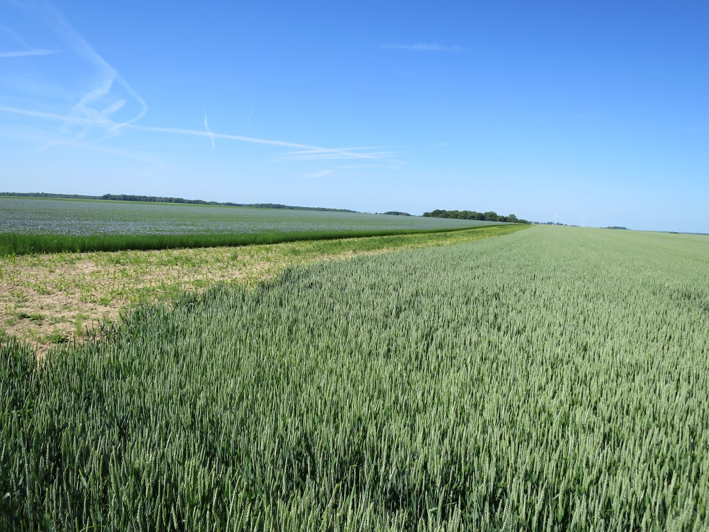 This is big country, the rich agriculture of la Beauce, large unfenced fields panels of different greens, rippling gold, hazy blue that stretch away in every direction, to woods, more fields, with a village steeple a distant punctuation mark. Wide blue sky with puffy clouds. Soft wind.