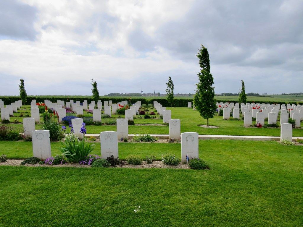 The Front ran south from the North Sea, through Ypres, Armentières, Vimy, Arras, Somme (such evocative names!), then swerved south-east, away from Paris (which was saved by the troops ferried to the front-line in a thousand red Paris taxis – each charging, it is said, the full fare). On through Verdun, to the Swiss border. It was the line at which the German advance was held. It quickly congealed into a barely-moving killing zone in which half a million British, a million French, and a million Germans died. My map marks cemetery after cemetery along it, ‘Brit’, ‘All’, unmarked. There are 350 in Flanders, 280 in Somme. And many ‘ossuaires’.