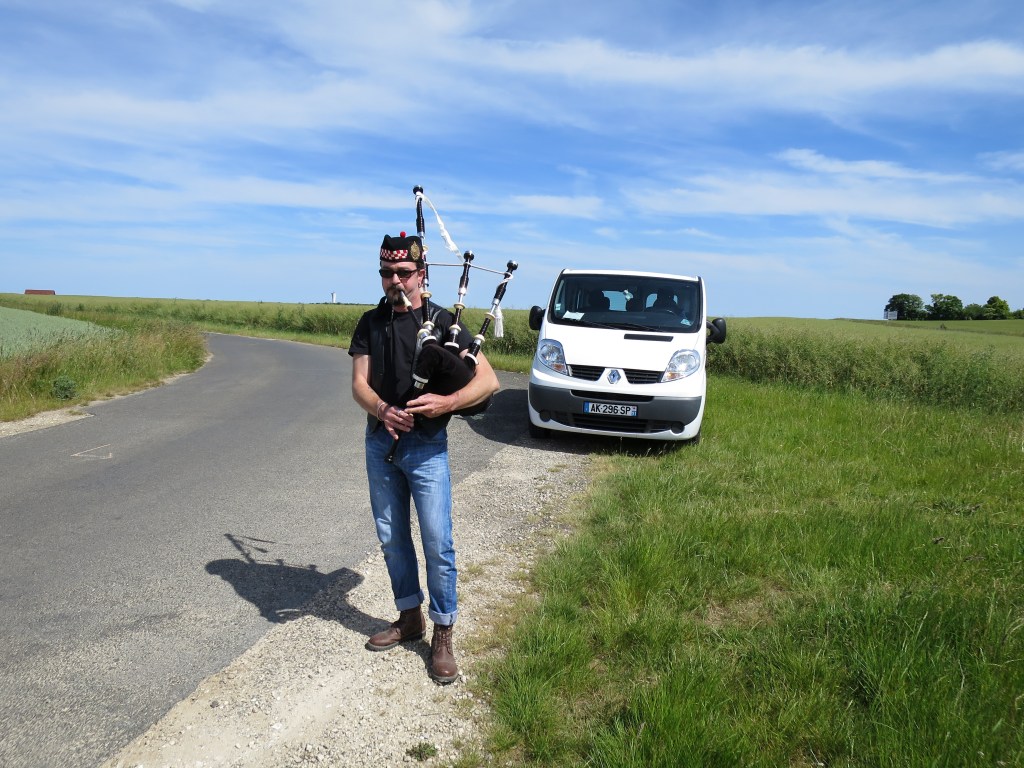 And then bagpipes begin to play. Fifty yards away, in the middle of nowhere, a young man in a kilt and a soldier’s bonnet is playing the bagpipes. For me? I rush over. Are you Scottish, what’s your name, where do you live, why are you here? I ask, in a rush. He is thirtyish, bearded, self-contained. He is French but of Scots descent. I hear his name as Michael Aye. He drives out from Étampes to be alone and play his bagpipes. I take his photo, shake his hand, and pedal on, accompanied by ‘Flower of Scotland’. I wave in that slow-motion way, like in Betty Blue. I’m in the world of all the films I’ve seen set in a perfectly-realised France. Now I’m in la France profonde.