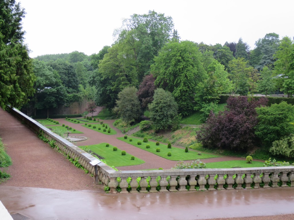Panels show the destruction of the town in both wars. This area was invaded three times in seventy years, as well as countless times through history, demonstrating that it is a fluid world in more ways than one. It is still surrounded by the elaborate defensive wall, built in the thirteenth century to resist the French, and then upgraded by Vauban against the Spanish, with its characteristic star pattern ‘crown’ around the abbey.