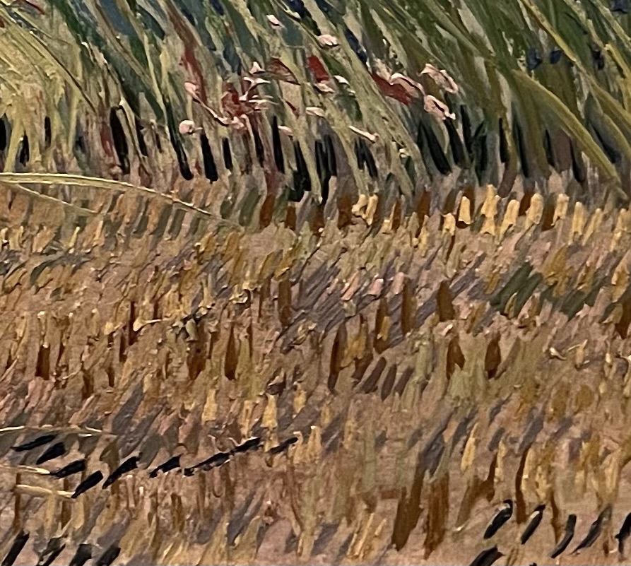 But this, as he says, is the outcome of ‘endless struggle and the destruction of images. I once said that only the iconoclast is a true artist, turning my incompetence into a virtue.’ What he sees and identifies with in Van Gogh is his perpetual working at the limit of possibility, the edge of failure, his paint marks (so many paint marks!) resisting the tip over (like Hokusai’s wave) into oblivion. No wonder Vincent’s constant fury, and the many evenings he was too weary even to write to Theo, and could only reach for the bottle.
